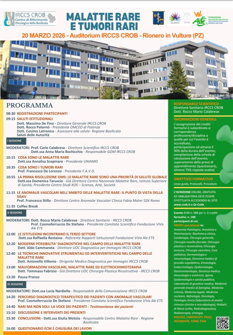 | 20 marzo - 8.30/16.00 Malattie Rare e Tumori Rari Rionero in Vulture (PZ) | Auditorium dell’IRCCS - CROB Per partecipare all'evento gratuito iscriversi cliccando qui Evento ECM |