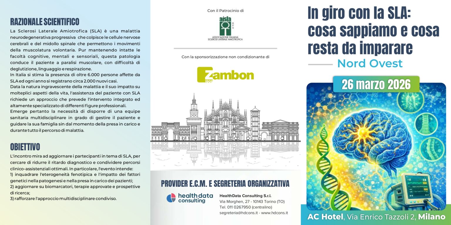 | 26 marzo - 09.30 In giro con la SLA: cosa sappiamo e cosa resta da imparare Milano | AC Hotel Milano (Via Enrico Tazzoli, 2) Evento ECM |